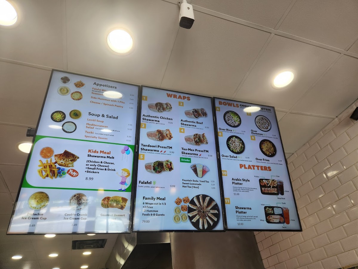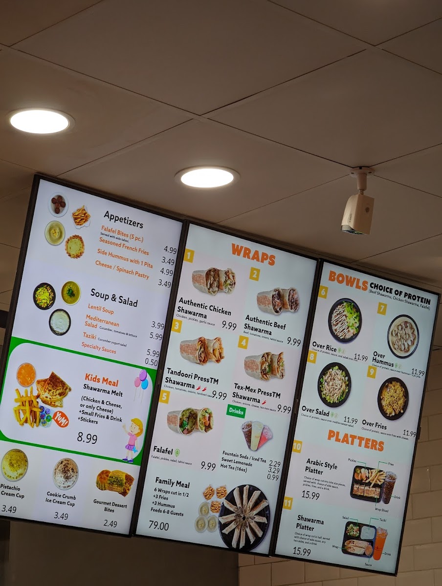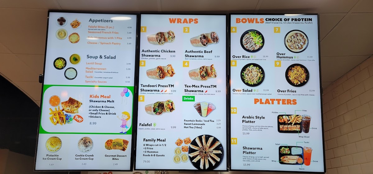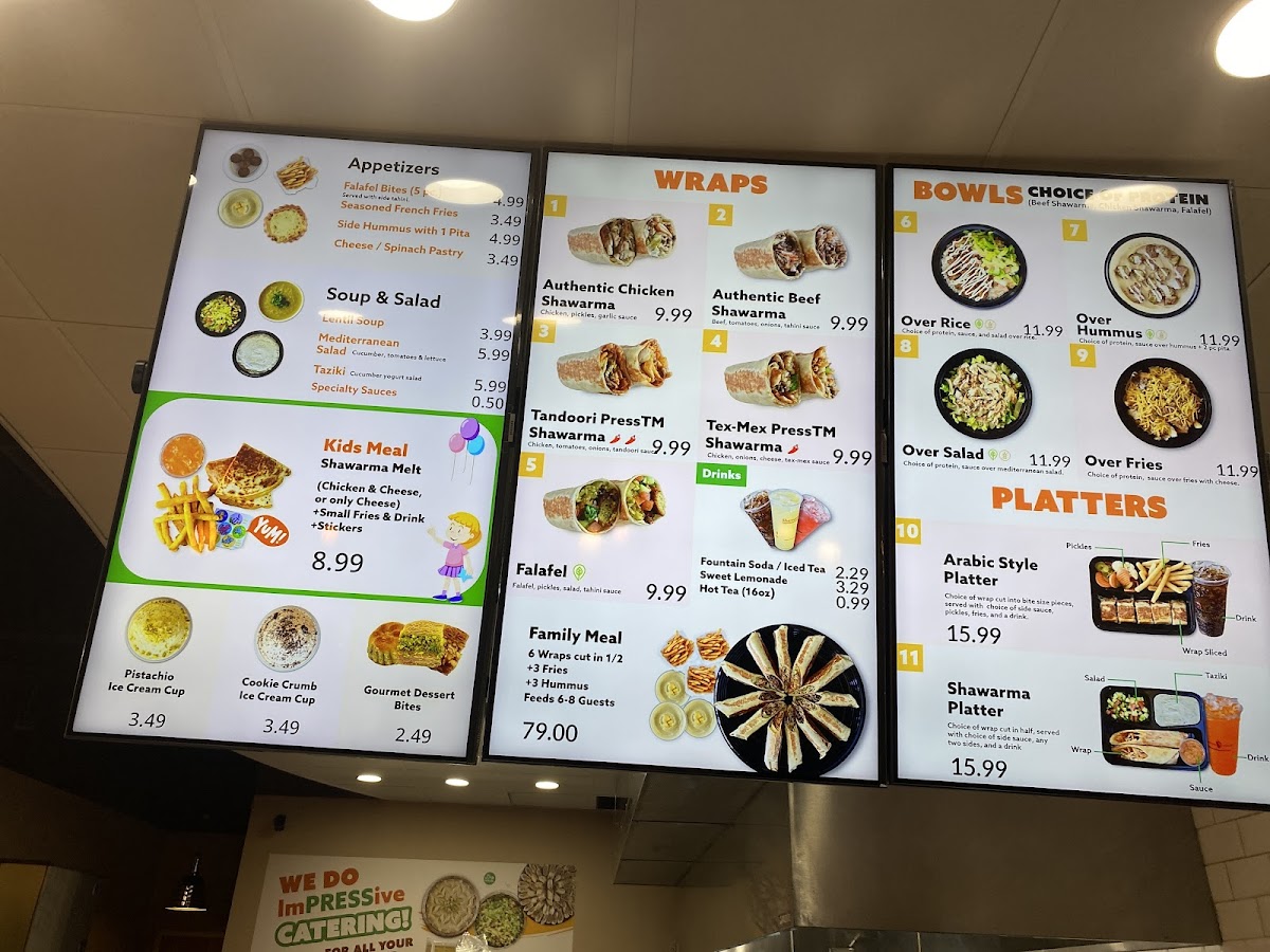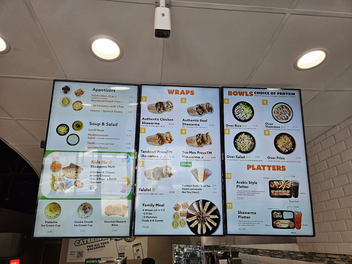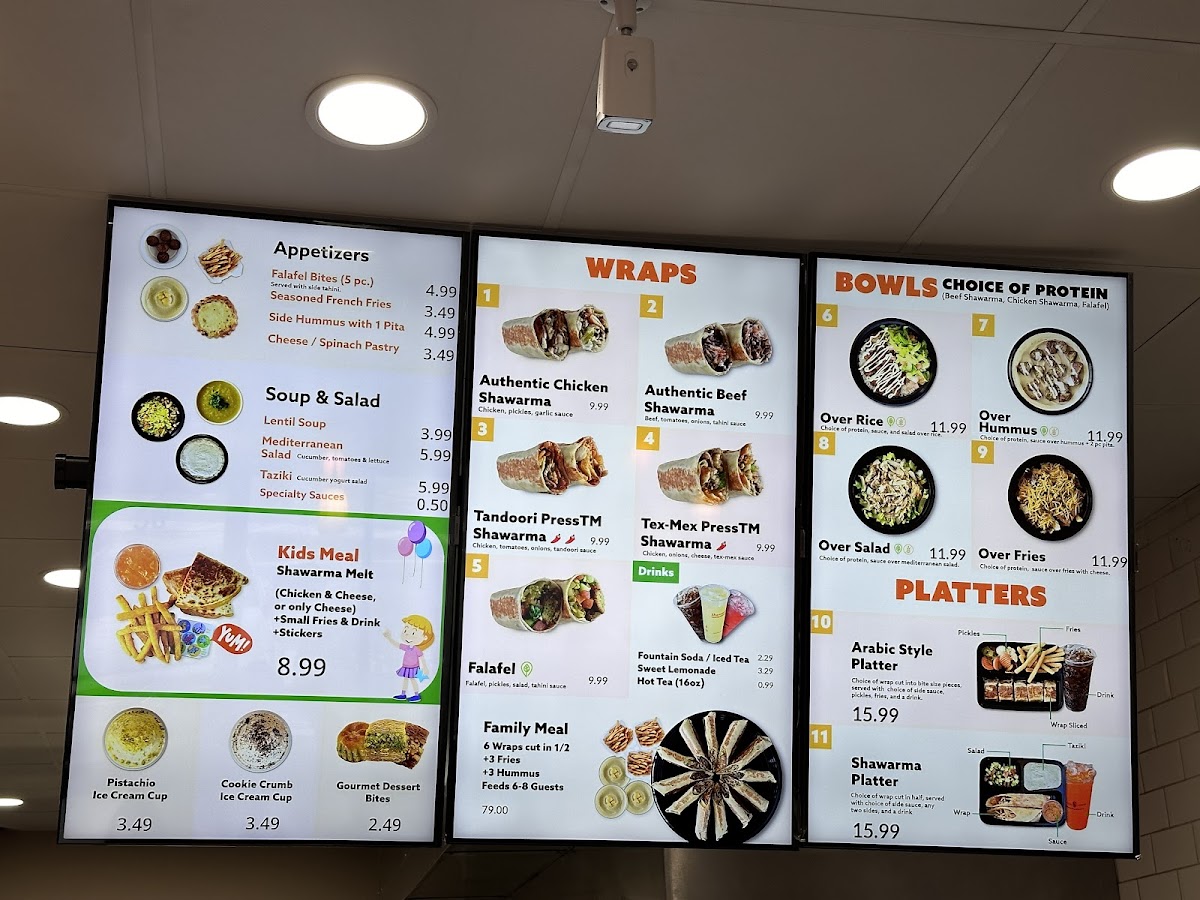 Popular choices include hearty family platters designed for sharing, such as a combo featuring multiple wraps with fries and hummus, as well as individual options like the classic chicken shawarma wrap or the spicy shawarma platter. Lighter fare and kid-friendly meals also fit naturally into the menu, alongside sides like falafel bites and sweet touches such as pistachio baklava. Refreshing drinks and juices complement the flavors and offer something cooling alongside the savory dishes.